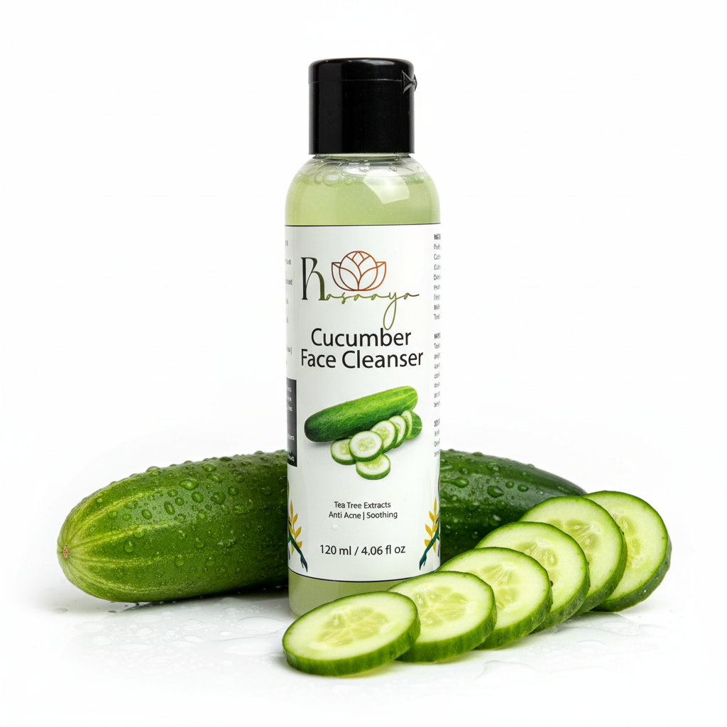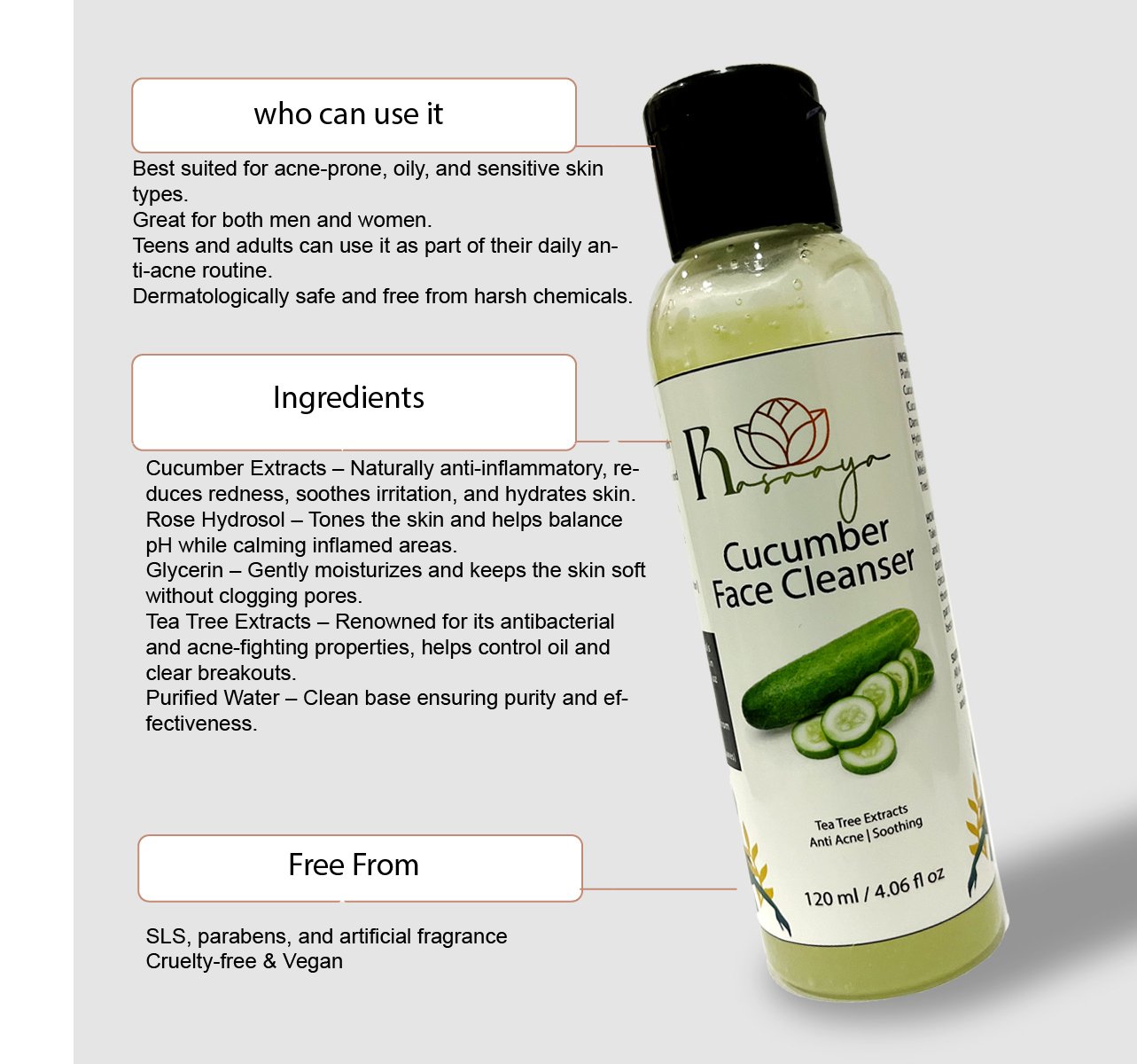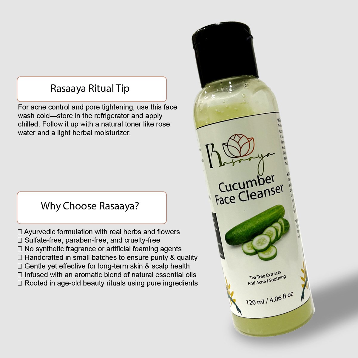 Rasaaya Cucumber Face Wash | Herbal Anti-Acne Cleanser with Tea Tree & Rose is a refreshing and anti-acne herbal cleanser that gently removes dirt, oil, and impurities while soothing inflamed and sensitive skin. Powered by cucumber extracts, tea tree, and rose hydrosol, this Ayurvedic blend helps unclog pores, fight acne-causing bacteria, and reduce breakouts—without stripping your skin of moisture.